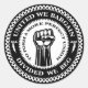 "Unidos negociamos -si nos dividimos- para formar una unión más perfecta". Diseño de sellos con centro de puño y borde de texto redondo, negro y blanco, en camisetas, caramelos, tarjetas, regalos.
