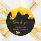 Un fondo negro chic decorado con miel dorada que gotea. El texto: gracias con un estilo de letra dorada manuscrita con florituras. Personaliza y añade un nombre y texto. Para recuerdos de fiesta de ducha de novia.