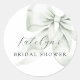 Green Bow Bridal Shower Classic Round Pegatina. Este elegante diseño presenta una suave proa verde sabio que simboliza el hermoso viaje de "atar el nudo", añadiendo un toque significativo a tu celebración, perfecto para una futura novia que valora tanto la sofisticación como la simplicidad.