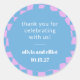 Estas pegatinas personalizadas presentan un patrón de cuadros azul y lavanda juguetón, añadiendo un toque moderno y caprichoso a tu celebración. Perfectas para sellar sobres, decorar bolsas de favores o añadir un detalle divertido a la decoración de la fiesta, son una opción versátil para bodas, duchas, cumpleaños y más. El texto blanco crujiente en el centro resalta hermosamente tu mensaje de gratitud junto con los nombres y la fecha de tu evento. Estas pegatinas son una forma simple pero elegante de unir tu tema y dejar una impresión duradera en tus invitados.