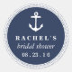 Los pegatinas clásicos de la ducha de novias estilo náutico cuentan con un borde de cuerda trenzado blanco y un ilustracion de ancla del barco sobre un rico fondo azul marino, con el texto de su personalizado — nombre, tipo de evento y fecha del invitado de honor. Coincide con nuestras invitaciones y accesorios de ducha de novia con trenzas náuticas.