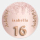 Pegatina para una fiesta de 16 años de dulce y glamoroso. Un falso fondo metálico de color dorado rosa con un elegante dorado rosa y goteo de purpurina rosa, pinta con goteo. El texto: Feliz y el número 16 está escrito con un tipo de letra estilo globo dorado. Personalice y agregue un nombre.