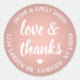 Añada un toque de acabado personalizado para agradecerle notas, favores de fiesta o decoraciones con estas elegantes etiquetas / sellos para sobres de direcciones redondas de caligrafía. Todo el texto se puede personalizar o eliminar. Relieve metalizado de imitación de color rosa moderno diseño minimalista con escritura elegante tipografía amor y gracias en el centro con nombre y dirección simples en círculo. Perfecto para un boda, una ducha de novia, un aniversario u otra ocasión.
