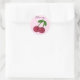 Un diseño divertido de cerezas jugosas y oscuras con hojas y tallos de color verde oscuro.