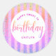 "Feliz 16 cumpleaños". Este impresionante, moderno, diminuto y brillante confetti azul turquesa falso purpurina puntos y el guion de la tipografía rosa naranja amarillo rosa oscura contra un fondo rayado rosa claro y arcoiris oscuro purpurina, pegatina redonda personalizada ayudará a hacer de su cumpleaños un fiesta a recordar. En esta moderna y especial colección también se ofrecen platos, servilletas y otros productos de cumpleaños. ¡Es un gran añadido a las fiestas! Simplemente teclee el nombre del chica de cumpleaños y puede personalizar fácilmente este pegatina redondo. Por favor, envíame cualquier pregunta o petición.