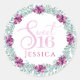 Estos pegatinas cuentan con una corona verde salada con flores moradas. En el centro está el texto acuoso que dice "Dieciséis Dulces" en cursivo con un lugar para personalizar con tu nombre.