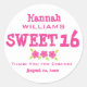 El texto rosado crea un dulce dulce 16 gracias pegatina. El texto rosado contiene una variedad de tipos de letra modernos y modernos, perfecto para un chica adolescente. Tres pequeñas flores lo hacen aún más dulce. Su nombre y apellido están en la parte superior. Sweet 16 está escrito en una fuente grande con tres pequeñas flores rosadas para llamar aún más la atención a su cumpleaños. Gracias por Comming está escrito en una sencilla letra rosa y luego su fecha de cumpleaños. Todo el texto se personaliza fácilmente.