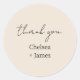 Moda y elegante pegatina boda 'gracias', con nombres de pareja en un conjunto contemporáneo de fuentes negras contra un fondo color melocotón claro. Este artículo forma parte de una suite boda que contiene invitaciones y material fijo en una variedad de elementos de mezcla neutros y coincidencias. ...