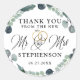 Hermoso boda gracias pegatinas con el mensaje GRACIAS DE LA NUEVA MR & MRS. acentuada con vegetación de eucaliptos azul y verde sabio de color agua y escritura moderna y elegante, anillos bodas y nombre y fecha. CAMBIOS: Cambia el estilo personalizado del tipo de letra del texto, color, tamaño y ubicación para un aspecto personalizado haciendo clic en PERSONALIZAR MÁS AÚN debajo de la sección PERSONALIZAR. Póngase en contacto con el diseñador a través de Zazzle Chat o makeitaboutyoustore@gmail.com si desea modificar este diseño o en otro producto.