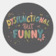 A vibrant, hand-lettered design featuring the phrase "Dysfunctional but Funny." This piece utilizes a muted retro color palette of sage green, dusty rose, and mustard yellow. The bubbly, 3D typography is surrounded by playful doodles, stars, and splatters, capturing a sense of charming chaos. Perfect for those who embrace their quirks with a sense of humor.