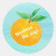 Un pegatina inspirador con un dibujo de una mandarina con lápiz de color y acuarela sobre un fondo de color azul turquesa.