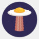 Ilustracion de personalizado vectorial de un delicioso OVNI de huevo frito al sol con una deliciosa barra de tractor de rodaja de tocino. Palabras clave: huevo, tocino, desayuno, OVNI, alienígena, soleado, lateral, personalizado, espacio, extraterrestre, comida, lindo, yolk, sci, ciencia, ficción, marciano, humor, carne, cerdo, secuestro