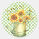 El diseño de campo/casa de campo de bonito presenta un ilustracion acuarela de una lata de agua de jardín con un ramo de girasoles sobre fondo de tablero de ajedrez verde y blanco