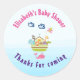 Una ducha de bebé gracias pegatina. Diseñado con un bonito ilustracion de estilo vivero, con un arca lleno de animales salvajes y una mariposa volando sobre sus cabezas y una agradable ballena salpicando agua debajo. Unas nubes azules flotan. Situado sobre un fondo oscuro azul claro.