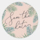 Los pegatinas de la moda de la isla con color de agua verde son el toque final perfecto para guardar las tarjetas de fecha y los sobres. El diseño presenta hojas tropicales de palmeras rodeando "guardar la fecha" en la tipografía moderna de escritura con letras a mano. Ideal para bodas de verano, de playa o de destino. Un fondo rosa pálido y ruidoso le da un toque tropical moderno y veraniego.