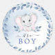 Pegatina Redonda Elefante con anémonas azules es un niño Baby Showe