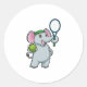 Pegatina Redonda Elefante en el tenis con raqueta de tenis