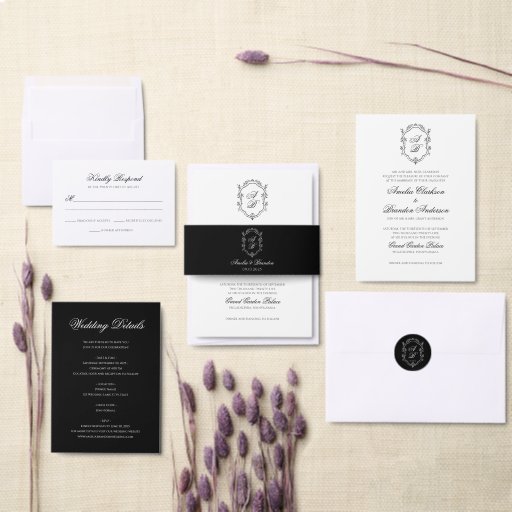 Elegant Black & White Floral Crest Wedding SuiteDiseñado por Jessica Senarlo