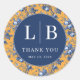 This wedding sticker features a vibrant design with a central navy circle adorned with elegant white typography, including initials and the phrase "Thank You." The background showcases a lively floral pattern in shades of blue on an orange base, creating a warm and festive atmosphere. The combination of detailed botanical illustrations and classic serif fonts gives the sticker a sophisticated yet celebratory feel, perfect for expressing gratitude at your special event.
