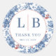 This Classic Round Sticker features a charming blue and white floral pattern, creating an elegant and inviting aesthetic. The design includes prominent initials "L" and "B," surrounded by delicate flowers that add a touch of sophistication. With a soft color palette and classic typography, this sticker is perfect for personalizing gifts or expressing gratitude in a stylish way. Its timeless look makes it ideal for various occasions, from thank-you notes to special event favors.