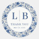 This elegant wedding sticker features a classic toile design with densely packed blue flowers and green leaves on an off-white background, creating a timeless and sophisticated look. The central circular element showcases bold serif typography with initials "L" and "B," accompanied by the phrase "THANK YOU" in uppercase letters, conveying gratitude and celebration. The intricate floral motifs, including stylized peonies and foliage, are depicted in a realistic yet decorative manner, enhancing the overall visual harmony. Perfect for acknowledging guests at your special event, this design exudes a polished and appreciative tone, making it ideal for weddings or formal occasions.
