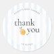 Add a sweet finishing touch to your favors with this lemon baby shower thank you sticker, featuring soft blue watercolor stripes, a charming hand-painted lemon, and elegant modern typography. Fresh, cheerful, and effortlessly refined, this design is perfect for sealing favor bags, envelopes, treat boxes, or gift wrap.