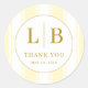 This Classic Round Sticker features a minimalist design with a soft yellow and white color palette, creating an elegant and sophisticated look. The layout includes vertical stripes framing the initials "LB" in a clean, modern font, accompanied by the phrase "Thank You" in a delicate script, conveying gratitude and appreciation. Perfect for personalizing gifts or expressing thanks, this sticker adds a touch of class to any occasion. Its simple yet stylish aesthetic makes it ideal for weddings, baby showers, or any special event where you want to show your heartfelt thanks.