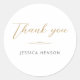 Elegant Minimalist Gold Script Birthday Thank you Round Sticker. A minimalist design and sophisticated gold script typography. Personalize with your name or message to create a thoughtful detail for your event. Ideal for birthdays party favors, these stickers elevate your packaging with a chic and stylish touch.
