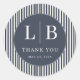 This Classic Round Sticker features a sophisticated design with a navy blue central circle bordered by alternating light and dark gray vertical stripes. The elegant layout includes large, uppercase serif letters "L" and "B," accompanied by the phrase "THANK YOU" in smaller, centered text, creating a formal and balanced appearance. The minimalist aesthetic is enhanced by crisp white lines and a restrained color palette, conveying professionalism and heartfelt gratitude. Perfect for acknowledging special occasions or expressing appreciation, this sticker combines clean geometry with refined typography to make a lasting impression.