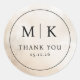 This Classic Round Sticker features a minimalist design with a clean, off-white background and black text. The layout includes large initials "M" and "K," separated by a vertical line, followed by the phrase "THANK YOU" in an elegant serif font. The overall style is modern and sophisticated, perfect for expressing gratitude at formal events or celebrations. Its simple yet refined aesthetic makes it ideal for personalizing gifts or acknowledging special occasions.