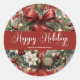 Featuring a luxurious design of lush greenery, white poinsettias, red berries, pinecones, and gold ornaments tied with a deep red satin bow, this beautiful sticker captures the warmth and joy of the holiday season. The elegant “Happy Holidays” script adds a classic and personal touch, customizable with your family name or special message.
