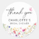 Expresa tu gratitud con estilo con esta elegante etiqueta redonda clásica de agradecimiento para ducha de novia con flores, que presenta una delicada acuarela de coloridas flores silvestres, embelleciendo bellamente las flores rosadas, entrelazadas con exuberante follaje y mariposas elegantes. Diseñada con caligrafía sofisticada, esta etiqueta añade un toque refinado y romántico, perfecto para sellar bolsas de favores, sobres o regalos. Un detalle encantador para complementar una fiesta de jardín o una ducha de novia "el amor está en flor", dejando a los invitados con una impresión sincera y elegante.