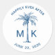 Pegatina Redonda Elegante Boda Tropical Monograma Azul de Palm Tree
