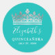 Pegatina Redonda Elegante Corona de Quinceañera Azul Turquesa y Pla
