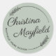 Elegante diseño de pegatina redondo personalizado para un pequeño empresario presenta su nombre y apellido en un guión moderno de caligrafía enmarcado por una corona redonda con hojas de laurel de moda rústica. Personalice el texto curvado con un nombre comercial u otro texto preferido. Se pueden modificar los colores gris, verde y negro.