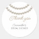 Ducha de novia elegante en blanco Pegatina clásica redonda con un collar de perlas plateado en acuarela. Es muy fácil de personalizar, con detalles de tus datos personales.