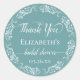 Estos hermosos pegatinas son perfectos para dar las gracias a los clientes en una ducha de novia. El diseño presenta un guión de caligrafía en un fondo de color verde azulado o turquesa con un borde de encaje floral blanco. El texto dice Gracias, con espacio para que el nombre de la novia sea y la fecha.