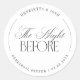 Esta elegante pegatina redonda de "La Noche Antes" presenta una tipografía clásica refinada con un sutil borde circular y una disposición monocroma limpia. La mezcla de letras con serifas y escritura suave le da un aspecto atemporal y discreto, perfecto para sellar sobres, cajas de favores o embalajes con un toque simple y elevado. Diseñada para eventos con una estética minimalista y clásica, esta pegatina combina perfectamente con un estilo moderno o tradicional.