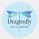 Diseño pegatina de libélula hermoso y elegante con nuestro ilustracion de libélula azul, acuática y verde verde azulado impreso a mano. Un fondo azul claro aporta un toque moderno y acogedor. Personalice con el nombre de la empresa. Todas las obras de arte contenidas en nuestro elegante pegatina de la libélula azul y acuática son obras de arte originales a mano de Moodthology. Puede personalizar el color de fondo, el tipo de letra y la disposición de su preferencia personal.