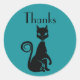 Elegante gato negro posando con una pata levantada. Tiene una cola linda y rizada y está usando un elegante atragantador en un pegatina de Gracias.