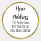 Un elegante guión negro está en la parte superior. Puede editar el guión si lo desea (se muestra: Nueva dirección). Tres líneas de texto que no es de script están bajo el guión. Puede editarlos para mostrar su nombre y su nueva dirección. El borde dorado no es Relieve metalizado.
