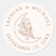 Añade un toque personalizado a tus sobres, favores de boda, y más con estos stickers de boda Elegant Moon and Stars terracotta. El diseño incluye un ilustracion artístico de la línea de terracota de una luna adornada con estrellas y follaje sobre un fondo crema. Sus nombres y fecha de boda se muestran en letras de terracota.