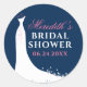 Los pegatinas que prefieren las duchas redondas de novias tienen un vestido boda, un esquema de color blanco, azul marino, rubor, y un texto rosa brillante y personalizado que se puede personalizar con el nombre de la novia y la fecha del evento.