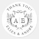 Elegante Pegatina Redondo Clásico de Hoja Vintage Monograma Boda Inicial. Iniciales monogramadas enmarcadas por una mano elegante ilustran escudo vintage en blanco y negro, sencillo y sofisticado estilo . La elección perfecta para los bodas modernos, clásicos y sencillos. Por favor, compruebe las piezas coincidentes de la colección.