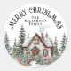 Agregue un toque festivo final a los favores de su fiesta navideña o sobres de tarjetas con esta encantadora pegatina de Navidad. El diseño presenta una acogedora cabaña de invierno de acuarela ubicada entre pinos y bayas de acebo, con detalles cubiertos de nieve, una guirnalda en la puerta y humo que sale de la chimenea, lo que aporta un cálido encanto invernal a cualquier celebración.