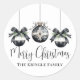 Agregue un toque festivo y elegante a sus tarjetas de Navidad, invitaciones de fiesta o regalos de favor con esta hermosa etiqueta de Navidad diseñada. Con tres delicados adornos de acuarela en tonos suaves de negro y blanco, acentuados con detalles de follaje perenne y lazos, esta etiqueta ofrece un aspecto simple pero sofisticado. "Feliz Navidad" se muestra en tipografía de letra cursiva elegante, mientras que el nombre de su familia se presenta a continuación en una fuente serif clásica, lo que la hace perfecta para agregar un toque personal a su temporada navideña. Ya sea para sellar sobres de correo o decorar favores de fiesta, esta etiqueta versátil combina elegancia y encanto con un diseño minimalista y moderno. Totalmente personalizable, puede ajustar los colores de la fuente o el fondo para que coincida con su tema de Navidad único. Perfecto para cualquier reunión navideña u ocasión festiva. Etiqueta redonda clásica para fiestas de Navidad con acuarela elegante para sobre o regalos de