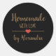 Elegante pegatina "casero con amor" con una fuente dorada sobre un fondo negro adornado por un lindo corazón rojo. Texto personalizado.