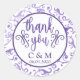 Flores violetas moradas, lavanda y blancas rodean las palabras GRACIAS en un moderno tipo de letra con letras a mano y tus iniciales y fecha boda en estos pegatinas que se pueden usar en favores matrimoniales, papelería y más! El estilo de letra, el tamaño, el color y la ubicación de las iniciales y la fecha se pueden cambiar para satisfacer sus necesidades. Póngase en contacto con el diseñador si desea realizar alguna personalización o desea que los elementos de coordinación completen su conjunto de bodas o fiestas.