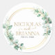 Elegante vegetación Eucalyptus Boda Botánico Pegatina Redondo Clásico. Con hojas de eucalipto acuarela y un marco geométrico redondo de oro.