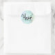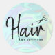 Un diseño pegatina redondo de estilo peluquero magnífico, con una textura holográfica de colores falsos y una elegante fuente caligráfica.